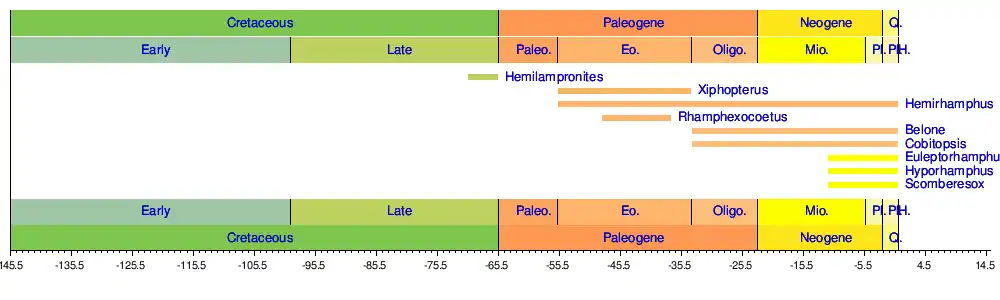 The oldest known fossil remains of the Beloniformes are from the Early Eocene-aged Monte Bolca site of Italy. These include the early halfbeak "Hemirhamphus" edwardsi and the early flyingfishes Rhamphexocoetus and "Engraulis" evolans.[8] The extinct family Forficidae (containing the genera Rhomurus, Forfex and Zelotichthys) is known from the Late Miocene-aged Los Angeles Basin deposits in southern California.[9] Forficidae is one of a few Pacific fish families that was extant during the Neogene but extinct today.[10]