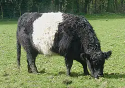The Belted Galloway derives from the traditional Galloway stock of the Galloway region of south-western Scotland, which in turn form part of a broader group of traditional Scottish cattle including the Aberdeen Angus and Highland breeds.[4]: 129 The Galloway is most often black, but other colours occur; the white-belted or white-middled Galloway was one of them. The origin of the white belt is unknown; it is thought to have resulted from some cross-breeding with the Dutch Lakenvelder in the seventeenth century.[4]: 129