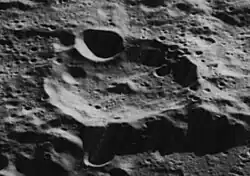 Belyaev is a lunar impact crater that is attached to the outer edge of the Mare Moscoviense, on the far side of the Moon. It is a worn formation with a small crater pair overlaying the southern rim, and several smaller craters across the relatively irregular interior.