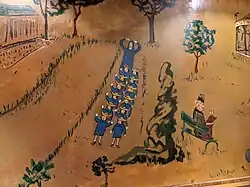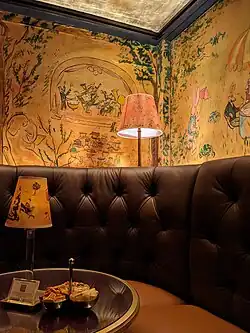 Bemelmans Bar is known for its walls, decorated with a work titled Central Park:[17] a pale yellow mural depicting Madeline, her eleven classmates, and their guardian in Central Park across four seasons. The painting has many vignettes with no central narrative; the vignettes are scattered throughout the room divided by painted trees and grass. The mural includes typical park scenes along with whimsical animals like a monkey-waiter serving two rabbit gentlemen, an ice-skating elephant, cigar-smoking bunnies, and rabbits building a snow bunny.[14][18] The work was painted by Ludwig Bemelmans, author of Madeline, in 1947. Bemelmans is the namesake of the bar, and his mural there is his only artwork remaining on display to the public. Other murals were in the Hapsburg House restaurant in the city, a nightclub on the Île Saint-Louis in Paris, and the playroom on Aristotle Onassis's yacht.[17] Instead of accepting payment for his work, Bemelmans received a year and a half of accommodations at the Carlyle for himself and his family.[19][4] Bemelmans painted himself into one of the scenes, depicted as a waiter or bartender holding a bill. As of 2000, this portion of the mural is a few feet to the right of guests facing the bar's cash register.[20] The entire artwork gives a playful feel to the otherwise sophisticated bar, adorned with dark leather and wood.[21][15]
