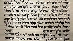 Bemidbar, BeMidbar, B'midbar, Bamidbar, or Bamidbor (בְּמִדְבַּר—Hebrew for "in the wilderness of" [Sinai], the fifth overall and first distinctive word in the parashah), is the 34th weekly Torah portion (פָּרָשָׁה, parashah) in the annual Jewish cycle of Torah reading and the first in the Book of Numbers. The parashah tells of the census and the priests' duties. It constitutes Numbers 1:1–4:20. The parashah is made up of 7,393 Hebrew letters, 1,823 Hebrew words, 159 verses, and 263 lines in a Torah Scroll (סֵפֶר תּוֹרָה, Sefer Torah).[1] Jews generally read it in May or early June.[2]