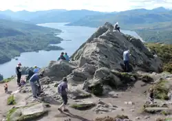 Ben A'an is situated in the Trossachs area of the highlands north of Glasgow, rising above Loch Katrine and Loch Achray. The summit area is largely treeless and comprises several rock outcrops and crags, its highest point being a rounded summit of 461 metres (1,512 feet) elevation,[1] unlike its lower west top.