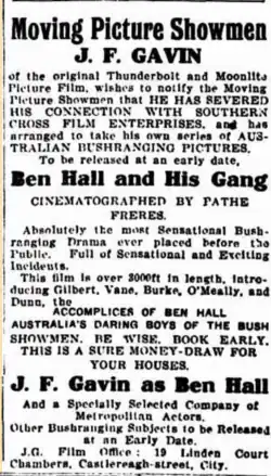 Gavin had made two successful bushranger biopic movies in association with H.A. Forsyth, Thunderbolt and Moonlite. However on 24 December 1910 (before Moonlite had been released) Gavin announced he had Forsyth had parted ways and he would be making a new film, a version of the Ben Hall story, through his own company.[12] He eventually formed a new partnership with the producing team of Stanley Crick and Herbert Finlay. Crick and Finlay were based out of offices at 75 York St Sydney.[13][11]