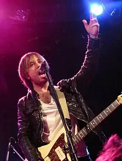 During this time, Blackbells toured the United States and Canada and performed with artists Alberta Cross, Band of Skulls, The Crash Kings, The Greenhornes, J Mascis, and Marcy Playground.[14][15][24] With the band, Rice made appearances at the 2010/2011 SXSW music festival,[25][26] showcased at Brooklyn-Vegan's 2010 "CMJ Showcase" (a music festival),[27] and played at the John Varvatos store in New York City.[28][29][30]