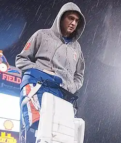 Scrivens started the 2010–11 season with the Reading Royals of the ECHL, the Maple Leafs' second tier affiliate. He played in 13 games with the Royals, winning 10.[2] For his efforts he was selected to represent the Royals in the ECHL All-Star Classic.[7] His strong play at the ECHL level, and injuries to other goaltenders in the Maple Leafs systems, earned Scrivens two separate callups to the Toronto Marlies of the American Hockey League (AHL), one in November[8] and one in February.[9] Scrivens was one of two goaltenders on the Marlies Clear Day roster announced on March 8, 2011, meaning he would be spending the remainder of the season at the AHL level, barring injury or suspension.[10]