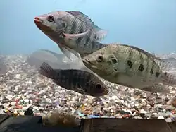 Fish that can be seen at the aquarium include eels, angelfish, glowlight tetra, hockey stick tetra, red-tail shark, catla, Indian tiger barb, mahseer, freshwater prawns, blue gourami, pearl gourami, gold fish, moon tail, and more.[1][2]