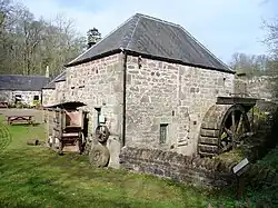 The mill building was in partial use until 1982 and was gradually restored to its present state from 1986 onwards. Parts of it date back to the 18th century, though there are records of milling at Benholm as early as the 13th century.[2] Other buildings on site are of mainly Victorian origin. The whole complex, with mill dam, reed bed, miller's croft and woodland walk, is now a local heritage visitor centre. The mill used to belong to Mr Lindsay Watson. Benholm itself today is a small hamlet made up of the former Benholm Parish Church (which is open to the public to view), the mill visitor centre & cafe and private dwellings.