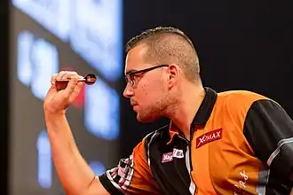 In January 2014, van de Pas entered the PDC Q School, earning a tour card on Day 1 with a 5–4 win over fellow BDO player and compatriot Joey ten Berge in the final round.[4] His first PDC major was the UK Open and he beat Doug Thompson and Davy Dodds both by 5–3 scorelines, before losing 9–3 to Paul Hogan in the third round.[5] Van de Pas reached the last 16 of a PDC event for the first time in May at the eighth Players Championship, but was defeated 6–1 by Simon Whitlock.[6] He won through to the semi-finals in the next event by seeing off the likes of Kevin Painter, Michael Smith and Mervyn King, but then let a 5–2 lead over Justin Pipe turn into a 6–5 defeat.[7] At the Gibraltar Darts Trophy, van de Pas averaged 104.86 in whitewashing Antonio Alcinas 6–0 in the first round and produced another stunning performance to beat world number one Michael van Gerwen 6–5, opening the game with a 10 darter and finishing it with an average of 106.72.[8] In the third round he missed three match darts at double top in the deciding leg against James Wade to be beaten 6–5.[9]