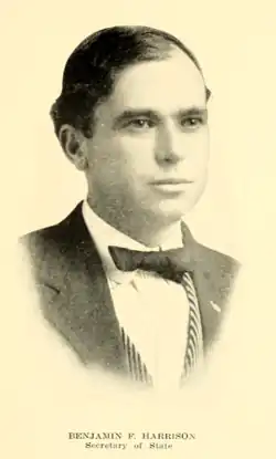 Benjamin F. Harrison was born in Antlers, Choctaw Nation on January 12, 1875, to a Chickasaw mother and a Choctaw father. He attended Wapanucka Institute in the Chickasaw Nation and later graduated from Trinity College of Arts and Sciences. After graduation he returned to Indian Territory to work as a schoolteacher before working for the Dawes Commission. He was a member of the Oklahoma Constitutional Convention. He represented Pittsburg County and Hughes County in the 1st and 2nd Oklahoma Legislatures. He was the speaker pro tem of the House during 2nd legislature.[1] Harrison ran in the 1910 Oklahoma elections for Oklahoma Secretary of State, defeating Leo Meyer in the Democratic primary. He went on to win the general election with 49.3% of the vote.[2] He was sworn in as the 3rd Oklahoma Secretary of State on January 9, 1911. He resigned from office sometime before January 2, 1915.[3]