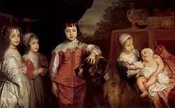Geere obtained significant furnishings and art works from the royal collection in 1650 in recompense of debts. Geere bought cloths of estate and Anthony van Dyck's portrait of The Five Children of Charles I. He died in 1654.[43][44] Anna Henshawe petitioned to recover debts due to her, and an annuity sequestered by Parliament. She had one of her petitions printed in 1654, and was awarded £8,000 in December 1655.[45]