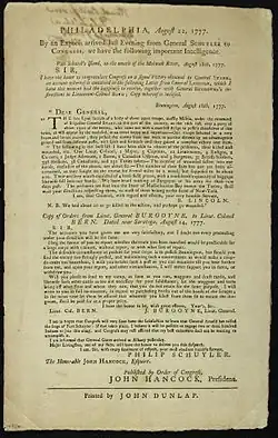 When Lincoln reached southwestern Connecticut, Washington first ordered him to prepare an expedition across Long Island Sound to raid British positions on Long Island. The expedition was aborted when Washington began to retreat from New York after the Battle of Long Island (Brooklyn) in August 1776, and Lincoln was ordered to bring two regiments to join Washington's army as it later retreated northward from New York Town.[16] Lincoln's troops secured the Continental retreat to White Plains, New York, and were in the main Continental formation during the subsequent Battle of White Plains in October 1776; this portion of the troops saw no action in the battle.[17] The enlistment terms of his men expiring, Lincoln returned briefly to Massachusetts to take command of new recruits for the coming year's campaigns.[18] Based on a recommendation from General Washington as "a gentleman well worthy of notice in the Military Line", Congress commissioned Lincoln a major general in the Continental Army on February 14, 1777.[19]
