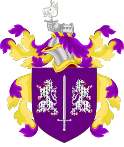 He adopted his father's coat of arms, Purpure a sword palewise proper between two lions rampant addorsed [Argent?].[13] The sword John III and Benjamin displayed was an epee; the only child of Sarah Knowles Bolton, librarian Charles Knowles Bolton, considered that the lions were likely Ermine rather than Argent.[14]