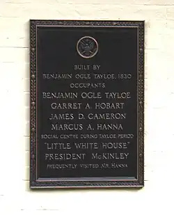 Cameron leased the house to Vice President Garret Hobart from March 1897 until the fall of 1899.[39] No other Vice President had ever lived so close to the White House,[40] and this close proximity helped boost Hobart's access to and influence with the President so much that he was called "Assistant President" and is now considered one of the most powerful Vice Presidents in U.S. history.[41] On several occasions Hobart entertained the entire U.S. Senate at the house, as well as President William McKinley.[42] The International Boundary Commission (which established much of the water and land boundary between the U.S. and Canada) dined in the house at a formal dinner hosted by Hobart, as did Prince Albert of Belgium.[43] The press and public nicknamed the house the "Historic Corner" and the "Cream White House" (a reference to the color of its brickwork) for the large number of politically important visitors and meetings held on the premises during Hobart's tenure there.[44] Hobart's failing health led the family to leave the Tayloe House in the fall of 1899 and return to New Jersey (where Hobart died on November 21).[39]