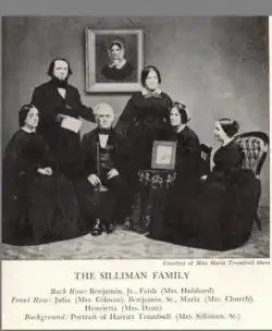 His first marriage was on September 17, 1809, to Harriet Trumbull,[a] daughter of Connecticut Governor Jonathan Trumbull Jr. Silliman and his wife had four children: one daughter married Professor Oliver P. Hubbard, another married Professor James Dwight Dana (Silliman's doctoral student until 1833 and assistant from 1836 to 1837);[4]: 7 and youngest daughter Julia married Edward Whiting Gilman, brother of Yale graduate and educator Daniel Coit Gilman. His son Benjamin Silliman Jr., also a professor of chemistry at Yale, wrote a report that convinced investors to back George Bissell's seminal search for oil. His second marriage was in 1851 to Mrs. Sarah Isabella (McClellan) Webb, daughter of John McClellan. Silliman died at New Haven in 1864 and is buried in Grove Street Cemetery.