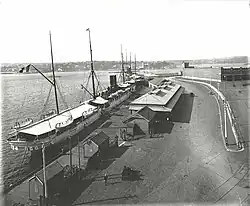 During the construction of Circular Quay in 1837–1844, the eastern side of the cove was used as a quarry and housed construction works. After the governor's residence was moved up the hill to the present Government House, in the 1840s and 1850s Macquarie Street was extended north through the Governor's Domain to Fort Macquarie. This led to the development of the area between the street and the shore into a commercial working wharf dominated by the wool trade, while the eastern side of the street remained part of the Domain. This part of Macquarie Street became known as the "wool store" end.[3] Wool and bond stores and warehouses appeared on the site. The historic "Moore Stairs" was built in 1868 as a passage between two wool stores, leading from the shore to Macquarie Street.[4]