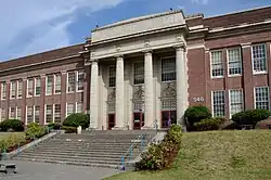 The Portland School Board voted to change the school's name to Benson Polytechnic High School after civic leader and philanthropist Simon Benson gave $100,000 in 1915, with a stipulation that at least the same amount of money be spent by the Portland School District to start the school.[8] Six blocks of land at Northeast 12th and Hoyt were purchased and a building was built, and the new Benson Polytechnic School opened its doors on September 4, 1917.[8] The building was designed by Floyd Naramore.[9] Portable classrooms were required early on and were still used into the 1950s.