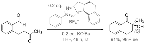 The asymmetric version of this reaction has been performed by utilizing chiral thiazolium and triazolium salts. Triazolium salts were found to give greater enantiomeric excess than thiazolium salts.[8] An example is shown below.[9]