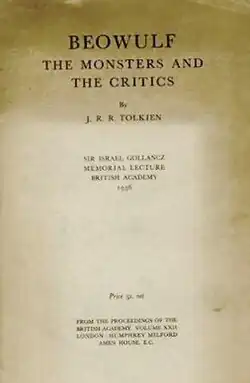 J. R. R. Tolkien's essay "Beowulf: The Monsters and the Critics", initially delivered as the Sir Israel Gollancz Memorial Lecture at the British Academy in 1936, and first published as a paper in the Proceedings of the British Academy that same year, is regarded as a formative work in modern Beowulf studies.[2][3][4][5][6][7] In it, Tolkien speaks against critics who play down the monsters in the poem, namely Grendel, Grendel's mother, and the dragon, in favour of using Beowulf solely as a source for Anglo-Saxon history. Tolkien argues that rather than being merely extraneous, these elements are key to the narrative and should be the focus of study. In doing so he drew attention to the previously neglected literary qualities of the poem and argued that it should be studied as a work of art, not just as a historical document.[8] Later critics such as Hugh Magennis, who agree with Tolkien on this point, have cited him to defend their arguments.[9]