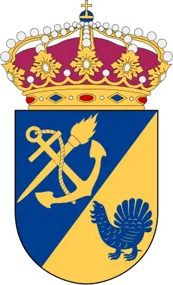 The coat of arms of the Berga Naval Training Schools 1955–1997. Blazon: "Per bend sinister azure an anchor cabled and a torch in saltire and or a cock-capercaillie, all counterchanged".[16]