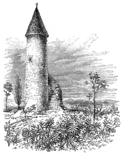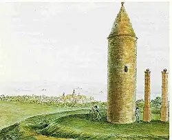 From 1484 until 1834, the Berger Warte was also the place of execution for the high court of the county Bornheimer Berg. The gallows placed there saw the execution of 36 convicted.[10] Up until the divide of the county between Frankfurt and Hanau in 1484, the place of execution had been in Bornheim at the gallows hill (German: Galgenberg). In 1735, the wooden gallows were replaced with one constructed from stone.[12] According to some stories, the gallows were demolished because their sight "disgusted" the Electoral Prince when having breakfast in the Rumpenheim castle (German: Rumpenheimer Schloss).[13] Still today in city plans the closest street is called "Am Galgen" (English: At the Gallows).[2][14]