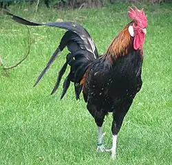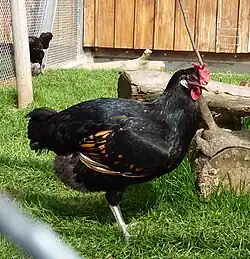 Only one plumage colouring is recognised, gold-laced black.[3][10]: 333 Hen birds are black with some gold markings on the wings and breast; cocks have gold neck-hackles and maroon markings on the wings. The black colour variety is extinct, black-silver coloured birds are extremely rare.[8] Like the Bergische Schlotterkamm, the Bergische Kräher shows typical broad lacing (German: Dobbelung) of the breast feathers.[7] Cocks weigh 3–3.5 kg and hens 2–2.5 kg. The comb is single, the earlobes are white and the legs are slate-blue.[7][10]: 333