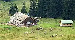 In the mountain Canton of Grisons in Switzerland, 225 alpine pastures were occupied by dairy cows in 2020. Around half of these were still alpine dairy farms and produced cheese directly on the alp. From the other alps, the milk is transported to the valley for processing. Both vehicles and cable cars are used for this. In the past, finished cheese wheels were often transported down to the valley on sledges, but today this is sometimes even done by helicopter. The cheese is then transported back down to the alpine pastures.[2]