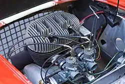 Power was provided by a British Anzani twin-cylinder 322 cc two-stroke engine producing 15 bhp (11 kW; 15 PS)[8] and mounted transversely, driving the front wheels via a chain and three-speed gearbox. The engine was already used by various motorcycle manufacturers such as Cotton and Greeves, but in the Berkeley was fitted with a Siba Dynastart to provide both battery charging and electric starting. It was an advanced two-stroke engine which incorporated a rotary inlet valve mechanism in the centre of the crankshaft.[8] The gearbox was a three-speed Albion HJR5, using a steering column-mounted gearchange.[7]
