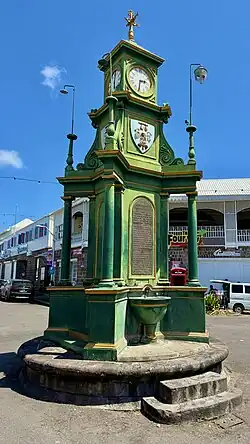 The structure contains a clock and a fountain. It was designed and built by George Smith and Co. from Glasgow, Scotland. The foundry produced two other similar structures, but only that of Saint-Christophe survived.[1]