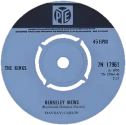 "Berkeley Mews" is a song by the English rock band the Kinks. It was released on a non-album single in June 1970, as the B-side to "Lola". Written and sung by bandleader Ray Davies, the song was recorded in early 1968 during the sessions for The Kinks Are the Village Green Preservation Society (1968). The title references a small street in London, while the lyrics recount a one-night stand. Influenced by the music of the 1940s, the song employs a heavier production than was typical for the band's 1968 work.