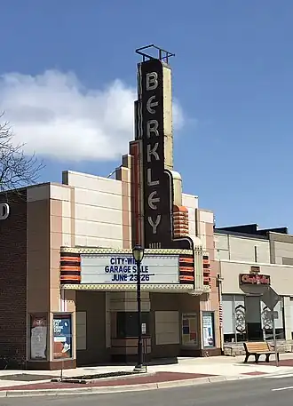 Downtown Berkley stretches along 12 Mile Road between Greenfield Road and Coolidge Highway, and along Coolidge Highway between 12 Mile Road and 11 Mile Road. Downtown Berkley is home to many restaurants, boutiques, clothing stores, and retail shops. Berkley's municipal offices, public library, and public safety headquarters are located near the intersection of 12 Mile Road and Coolidge Highway. Downtown Berkley hosts an annual Art Bash, which drew roughly 10,000 people to the city's commercial sector in 2016.[14] The Art Bash brings local artists from all over Michigan to sell art from photographs, garden art, jewelry and pottery to clothing accessories and paintings. Local stores and shops also participate in the festivities holding sidewalk sales. The city is an active participant in the annual Woodward Dream Cruise, a popular classic car showcase in the Metro Detroit area. Berkley hosts a classic car parade Downtown, called the Berkley CruiseFest. It holds the festivities one day before the official date of the Dream Cruise,[15] and has done so every year since 1995.[16]