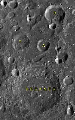 By convention these features are identified on lunar maps by placing the letter on the side of the crater midpoint that is closest to Berkner.