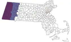Politically, Berkshire County, Massachusetts, was formed as a governmental unit in 1761. It includes the western extremity of the state, with its western boundary bordering New York and its eastern boundary roughly paralleling the watershed divide separating the Connecticut River watershed from the Housatonic River and Hoosic River watersheds. However, like most other counties in Massachusetts, the active governmental role of Berkshire County has been abolished, so has no legal or governmental function.[4]