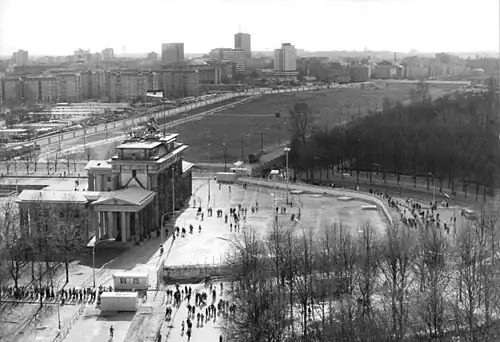 - Brandenburg Gate between Berlin-Tiergarten and Berlin-Mitte, opened on 13 August 1961. On 14 August West Berliners gathered on the western side of the gate to demonstrate against the Berlin Wall. Under the pretext that Western demonstrations required it, the East closed the checkpoint the same day, 'until further notice', a situation that was to last until 22 December 1989.