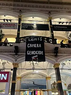 In the introductory press release for the 2024 festival, Berlinale opted not to mention freedom of speech as one of their core values, despite having done so in the previous year's statement.[31][32] During the festival, hundreds of past and present Berlinale participants signed open letters criticizing Berlinale's complicity in Germany's censorship of pro-Palestine voices amidst the backdrop of the Gaza war, including over 280 Berlinale Talents alumni,[33] over 190 filmmakers with films in the 2024 festival[34] and over 60 Berlinale contractors.[35] In further protest, John Greyson, Suneil Sanzgiri and Ayo Tsalithaba all withdrew their films from the festival, while Maryam Tafakory, Advik Beni, and Monica Sorelle dropped out of the Berlinale Talents programme, and Emilia Beatriz withdrew from the European Film Market.[36] Unlike its response to the public's outrage at the AfD invitation, Berlinale directors remained silent to the demands of their filmmakers, alumni, and contractors in support of Palestine.[36]