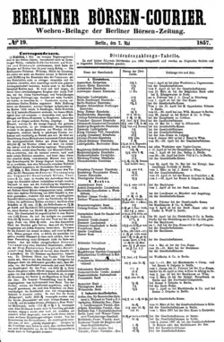 ![]() Newspaper front page of Berliner Börsen-Courier as of 7 May 1857, weekly supplement of Berliner Börsen-Zeitung (1855–1944) | |