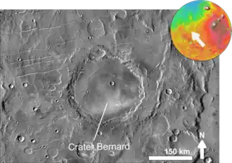 Bernard is a large crater in the Memnonia quadrangle of Mars, located at 23.4° south latitude and 154.2° west longitude. It is 128 km in diameter and was named after P. Bernard, a French atmospheric scientist.[1] The floor of the crater contains large cracks, which may be due to erosion.