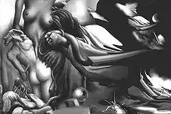 He is currently working mostly in digital media,[2] oil paints, and pencil. He is also doing Exquisite corpse works[3] in collaboration with many artists internationally,[4] and these collaborative works have recently been exhibited in galleries across France.[5] 70 of these collaborations, drawings and paintings, were part of his personal exhibition "Dreaming Deep" in Healdsburg, California, in 2019.[6] Since of 2019, he uses artificial intelligence to create models which are then produced very faithfully in a traditional way in drawing or painting.