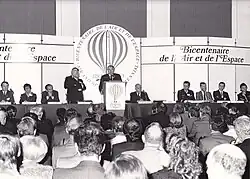 Bernard le Grelle was appointed director of the National Air and Space Bicentennial Agency by the French Presidency in 1982.[58] In June 1982, he was approached by Larry Mihlon, a former member of President Kennedy's space team, to set up a similar organization in the United States and became a founding member of the US Bicentennial Committee. The United States Organizing Committee of the 1983 Air and Space Bicentennial Committee included Senator Charles Mathias,[59][60] appointed Chairman, President Ronald Reagan, Honorary Chairman and Vice President George Bush, Honorary Vice-Chairman General Clifton von Kann (Director), President of the National Aeronautic Association, Anna Chennault, Senator John Glenn, Senator Barry Goldwater, Apollo 17 astronaut and Senator Harrison Schmitt, Scott Crossfield, Apollo 11 astronaut Michael Collins and Walter J. Boyne, Acting Director of the National Air and Space Museum. On July 12, 1982, Senator Mathias introduced S.J.Res.270, a joint Congressional resolution to designate 1983 as the Bicentennial of Air and Space Flight.[61] On January 3, 1983, President Ronald Reagan signed the Official Proclamation to designate the year beginning January 1, 1983, as the Bicentennial of Air and Space Flight, which became Public Law (No: 97-413).[62][63] On November 9, 1982, Mathias, Mihlon and Le Grelle did organize a ceremony in the Senate caucus room in the Russell Senate Office Building to launch the Bicentennial Year. The event televised life, hosted by Vice President Bush included a taped message from President Reagan[64]