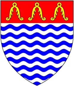 Arms of Smith of Totnes, as seen impaled by Wrey on monument to John I Wrey (d. 1597) in Tawstock Church, Devon. Wrey's son John II Wrey was the 3rd husband of Smith's daughter Eleanor Smith: Barry undé of sixteen argent and azure on a chief gules three barnacles or. Pole (d. 1635) gives the arms as: Barry undé of six argent and azure on a chief gules three barnacles or[1]