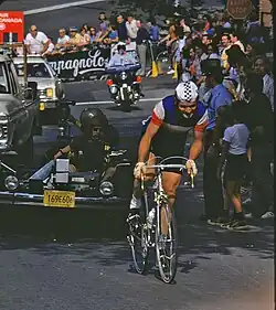 Bernard Thévenet (French pronunciation: [bɛʁ.naʁ te.və.nɛ]; born 10 January 1948) is a retired professional cyclist. His sporting career began with ACBB Paris.[1] He is a two-time winner of the Tour de France and known for ending the reign of five-time Tour champion Eddy Merckx, though both feats are tarnished by Thévenet's later admission of steroids use during his career. He also won the Dauphiné Libéré in 1975 and 1976.