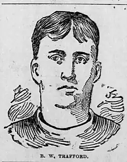 Trafford was a prominent fullback for the Harvard Crimson football team from 1889 to 1892,[2] captain of the 1891 and 1892 teams.[3][4][5][6] He kicked five field goals in a game against Cornell in 1890, a season in which Harvard was national champion.[7] Trafford scored 64 points in a game against Wesleyan in 1891,[8][9] and led the nation in scoring that year with 270 points.[8] His teammate Everett Lake led the nation in touchdowns the same season. Trafford was captain of the first team to employ the flying wedge blocking scheme.[10] Trafford helped coach the 1893 team.[11] After college, he was employed at the Bell Telephone System, then as a banker in Boston.[12]