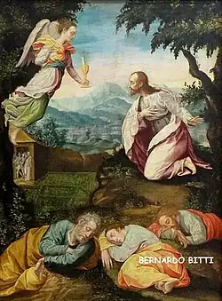 Bitti returned to Lima and continued to work there until his death in 1610.[3][2] At the time of his death, Bitti was an esteemed artist.[5] Bitti is considered the founder of the Cusco School of painting.[3] Even though many other Italian painters followed in his footsteps to South America – including Matteo Pérez and Angelino Medoro immediately in his year of arrival – few became as influential as Bitti,[3][6] whose influence on painting in Viceroyal Peru was decisive. Although Bitti never stayed in one place long enough to establish a workshop or train apprentices,[1] his work influenced many painters of the Andes,[2] especially in Cusco and the Audiencia of Charcas in Bolivia.[5] Gregorio Gamarra is the only artist known to have been a proper follower of Bitti.[1] Lázaro Pardo de Lagos, Diego Cusi Guamán,[2] and Pedro Bedón also exhibit influences. Through Bedón, Bitti influenced the Quito School.[5] Many yet to be attributed works in Peruvian churches and monasteries also carry the hallmarks of Bitti's influence.[1] Because of Bitti's influentiality, Mannerism featured in Peruvian and Bolivian art even after the style went out of fashion in Europe.[5]