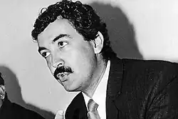 Since his murderer, Gutiérrez Maya, was 16 at the time of the assassination, he didn't go to jail, but to a minors facility.[7] He was killed about a year later, with his father, as he had been allowed to be out of the correction facility temporarily.[8] Gutiérrez Maya was a friend and coworker of Gerardo Gutiérrez Uribe, killer of Carlos Pizarro.[9] The crime was originally attributed to Pablo Escobar, but the drug lord denied his involvement and even argued he had asked against it.[9][10][11] An anonymous call to a radio station in Medellin attributed the murder to the paramilitary organization of Fidel Castaño, who apparently had inherited the criminal structure of Gonzalo Rodriguez Gacha, who had been killed months before.[11] No one has been officially condemned by the assassination,[12] but current consensus supports the hypothesis that the paramilitary organization of the Castaño brothers was behind the crime, even acknowledged by Carlos Castaño.[1] On February 11, 2010, Alberto Romero, an ex director of the DAS (Colombian Security Service), was charged as being linked to the murder, together with Carlos Castaño, the chief of the AUC (paramilitary forces).[13]