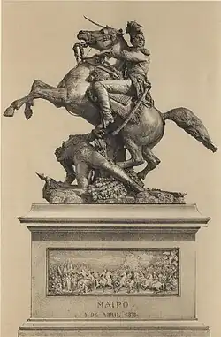 Made by the French sculptor Albert-Ernest Carrier-Belleuse, it was inaugurated on May 19, 1872. Its pedestal presents four bas-reliefs that represent the life of the hero, two of them made by the Chilean sculptor Nicanor Plaza. It was inaugurated on May 19, 1872.[1]