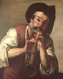 His boisterous The flute player (Palazzo Rosso, Genoa), which also exists in several replicas, is another genre painting that shows its indebtedness to Flemish genre art in its subject, palette and painterly technique.[15] Strozzi's use of coloured shadows is indebted to Rubens, but rather than adopting Rubens' practice of allowing a light-coloured ground to occasionally emerge on to the surface, Strozzi worked on a reddish-brown ground with light brushstrokes in paler colours.[1]