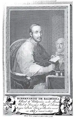 Bernardo de Balbuena (c. 1561 in Valdepeñas, Spain – October 1627, in San Juan, Puerto Rico) was a Spanish poet. He was the first of a long series of Latin American poets who extolled the special beauties of the New World.