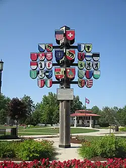 The Muensterberg Plaza built around the clock tower also features The Settler's Statue commemorating the arrival of the first settlers to the area, the only stateside Canton Tree, and a series of flowerbeds laid out to resemble common quilting patterns.
