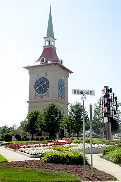 The idea of building the clock tower and plaza was first raised in 2001 while the city of Berne was planning for its sesquicentennial. Wanting to celebrate the city's Swiss heritage, it was decided to model the clock tower after the medieval Zytglogge in Bern, Switzerland, the oldest monument in that city (built c. 1220, repaired in 1405). The clock tower and plaza were given the name Muensterberg (Münsterberg) after the small Mennonite community in the Jura Mountains of Switzerland that Berne's first immigrants came from.[7] The clock tower was constructed in 2010. It stands 160 feet tall and 32 feet wide, weighing approximately 1,216 tons (over 2.4 million pounds).[36] It contains carillon bells created by the Verdin Company.