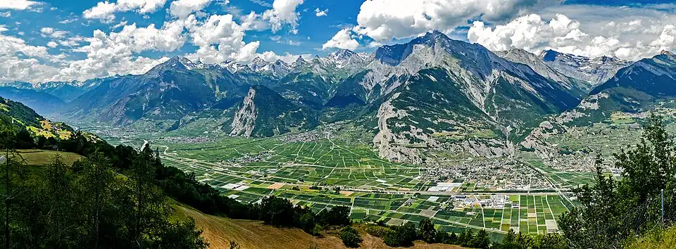 One of the most prominent Alpine ranges, the Bernese Alps extend from the gorge of Saint-Maurice, through which the Rhône finds its way to Lake Geneva, to the Grimsel Pass or, depending on the definition, to the river Reuss (thus including the Uri Alps). The principal ridge, a chain that runs 100 kilometres (62 mi) from west (Dent de Morcles) to east (Sidelhorn), whose highest peak is the Finsteraarhorn, forms the watershed between the cantons of Bern and Valais. Except for the westernmost part, it is also the watershed between the Rhine (North Sea) and the Rhône (Mediterranean Sea). This chain is not centered inside the range but lies close (10 to 15 km) to the Rhône on the south. This makes a large difference between the south, where the lateral short valleys descend abruptly into the deep trench forming the valley of the Rhône and the north, where the Bernese Alps extends through a great part of the canton of Bern (Bernese Oberland), throwing out branches to the west into the adjoining cantons of Vaud and Fribourg. There the mountains progressively become lower and disappear into the hilly Swiss Plateau.[3] The Bernese Alps have a large influence on the climate of Switzerland: while their north side is very exposed to weather, their south side is protected from it. As a consequence, agriculture consists essentially of dairy farming and cattle breeding on the northern foothills, while on the sunnier southern foothills (Rhone Valley) it also consists of vineyards.