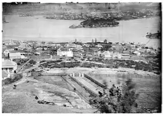 Holtermann financed and possibly participated in Beaufoy Merlin's project to photograph New South Wales and exhibit the results abroad to encourage immigration. The work was taken up after Merlin's death in 1873 by his assistant, Charles Bayliss. In 1875, Holtermann and Bayliss produced the Holtermann panorama, a series of "23 albumen silver photographs which join together to form a continuous 978-centimetre view of Sydney Harbour and its suburbs."[10] Some of the photographs, including the panorama, were displayed at the Philadelphia Centennial Exhibition, where they won a bronze medal.[10] The panorama was also displayed at the 1878 Exposition Universelle Internationale in Paris.[10]